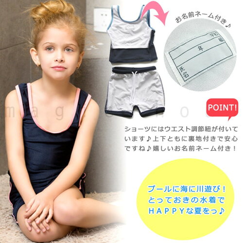 ・嬉しいお名前欄付き ・軽くて丈夫なやわらか速乾素材 ・パンツのウエストは紐付きで調節可能 ・素材: ナイロン 85% ポリウレタン 15% 主な仕様 ・肩ひものパイピングがかわいい新作のガールズスクール水着! ・軽くて丈夫、トップスとショーツが別々のおしゃれなセパレートタイプ♪